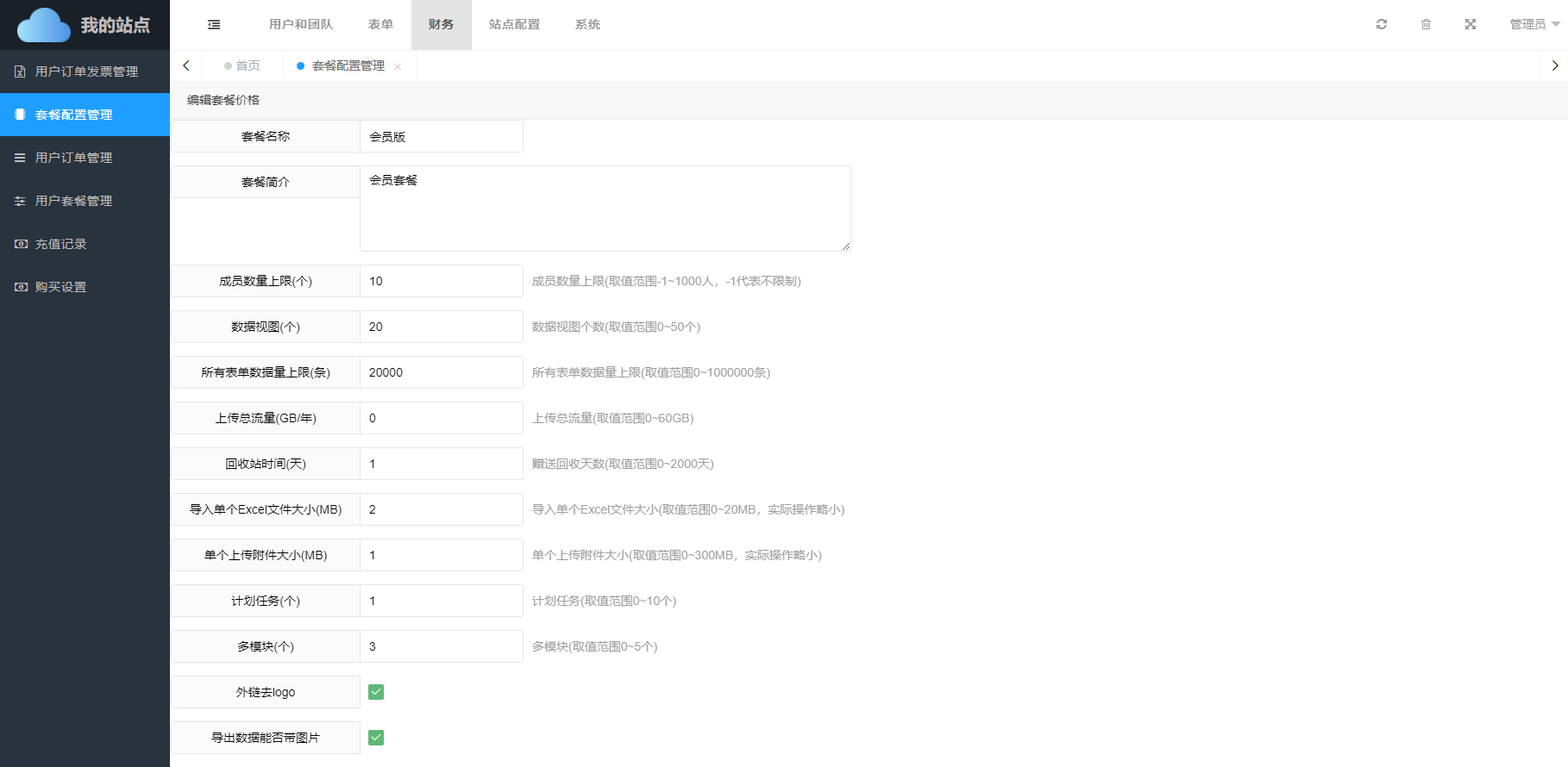 套餐名称可自定义修改,套餐的价格、各项配置数值均可自定义设置。