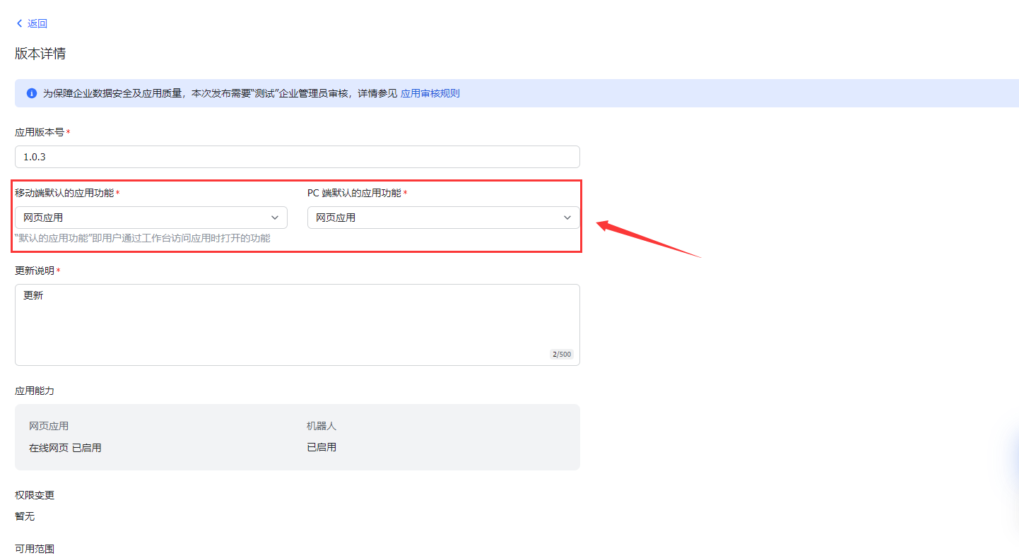 填写版本信息,把默认应用功能改为网页应用
