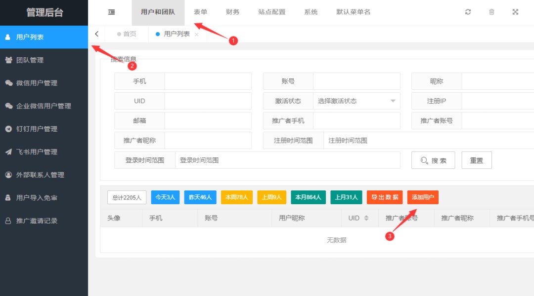 登录私有云管理后台,后台网址:https://私有云域名/admin,在用户列表->添加用户中新添加个普通账号用于绑定企业微信自建授权,如已经进行了短信集成也可以直接在前台进行注册