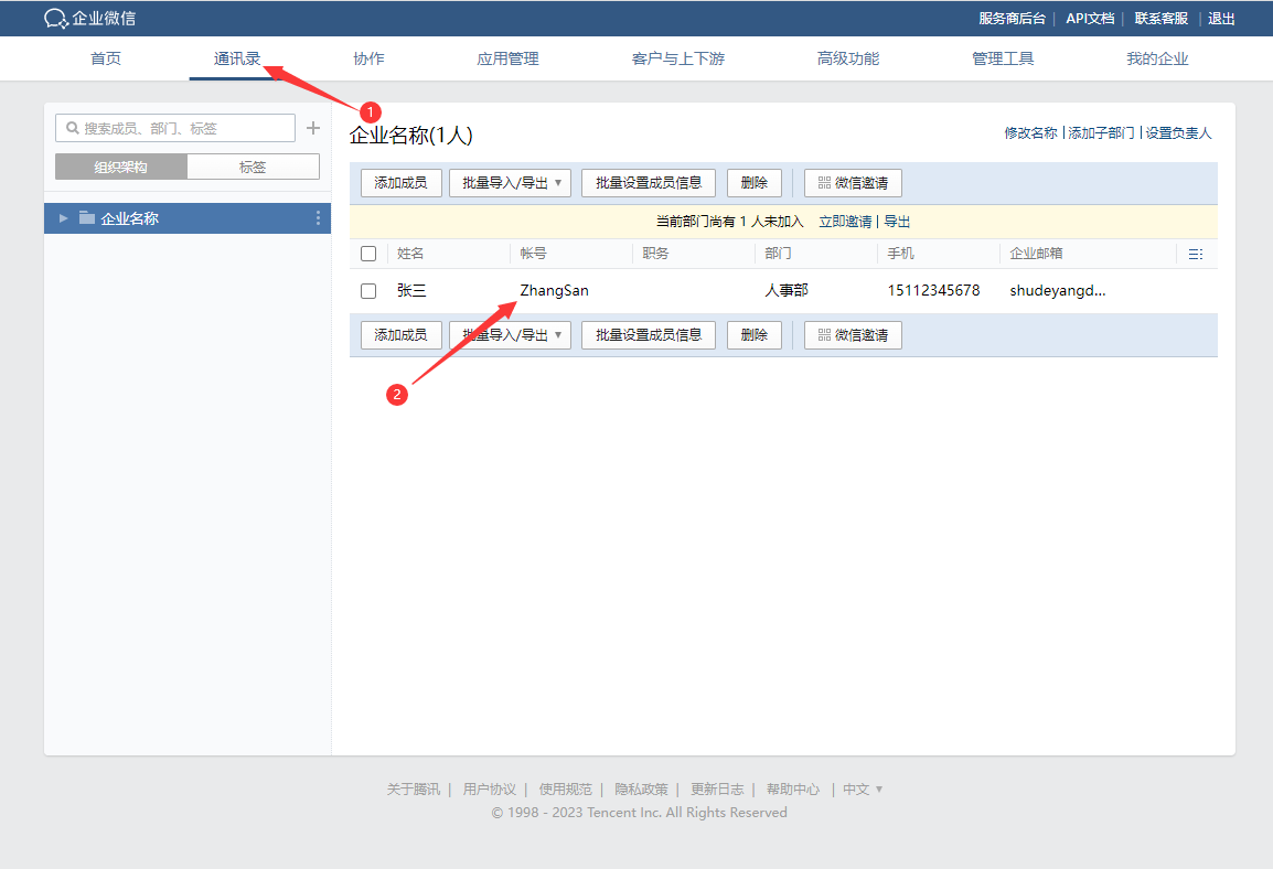进入【企业后台管理】->【通讯录】->【企业微信成员列表】页面获取成员账号(如果账号字段没有显示出来可点击进入成员详情获取)