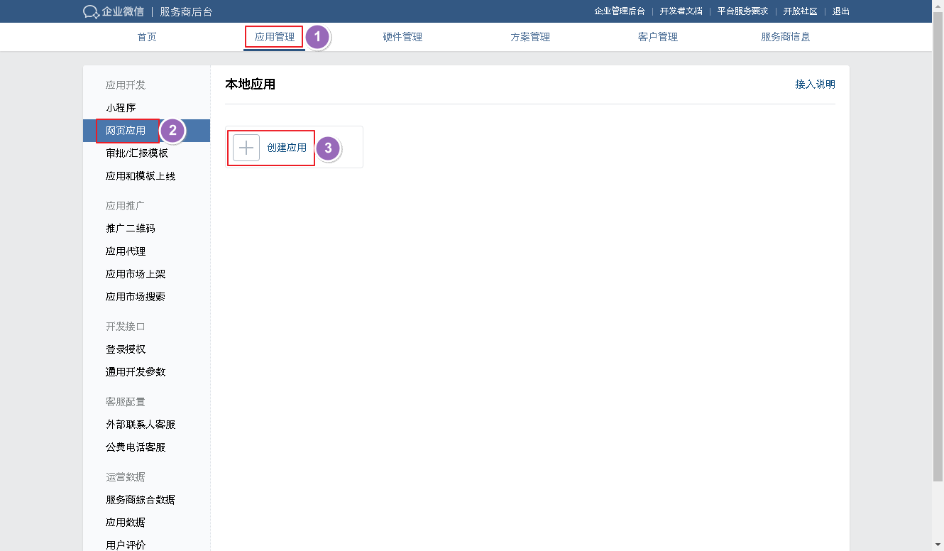 在【应用管理】页面点击【网页应用】->【创建应用】