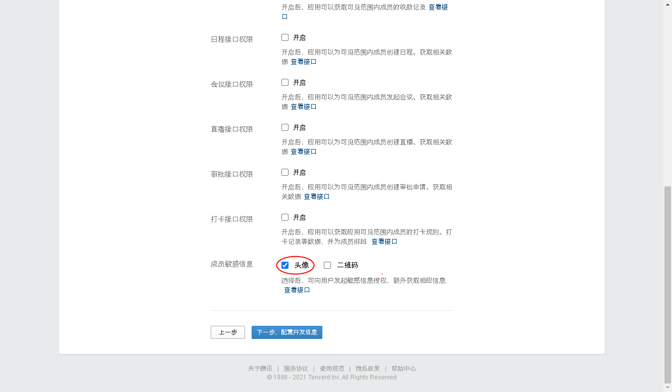 应用权限部分需留意最下方成员敏感信息处,需勾选