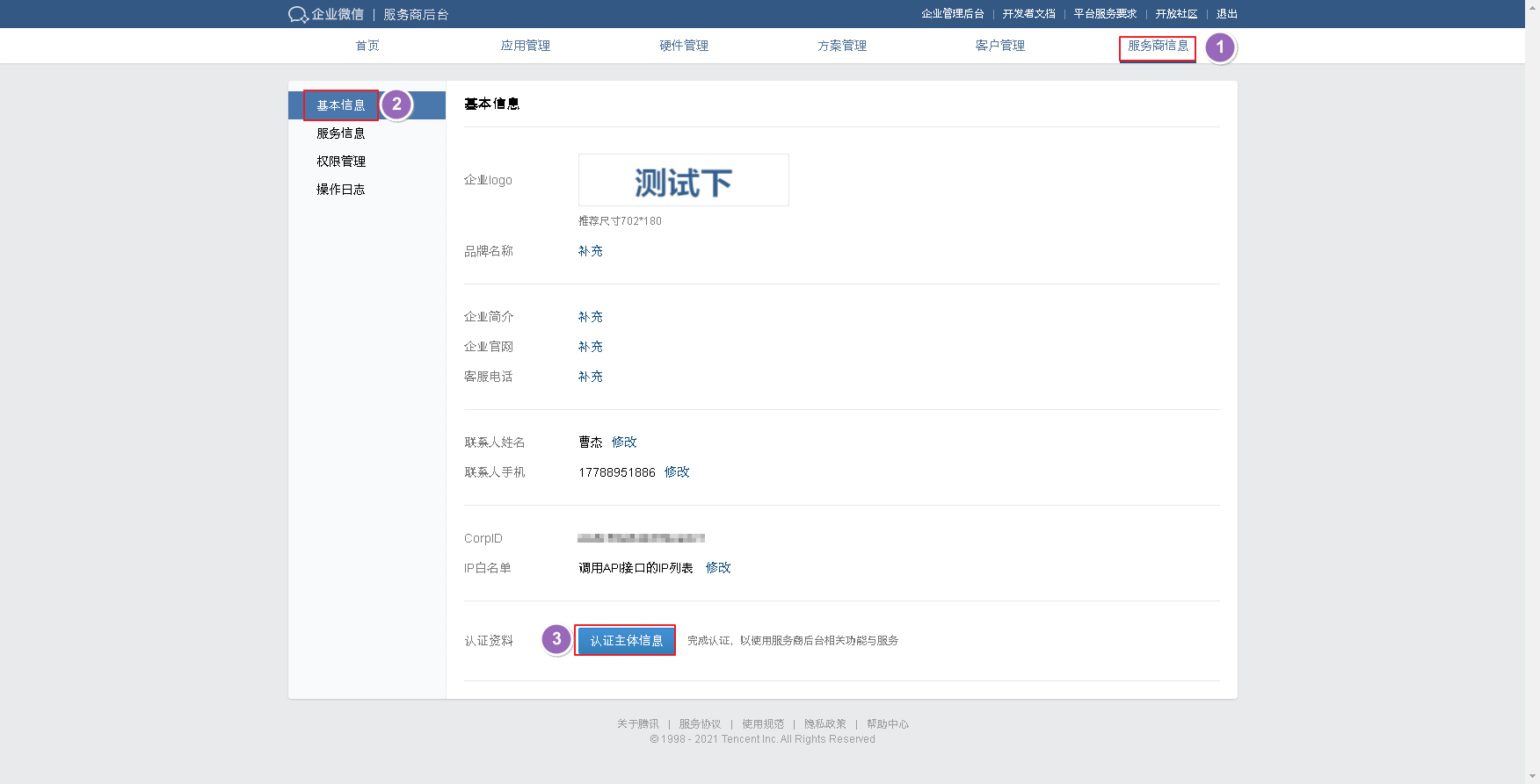 点击【服务商信息】,如果这里提示需要认证主体信息,则需要企业先对企业进行认证,认证后方可进入下一步操作