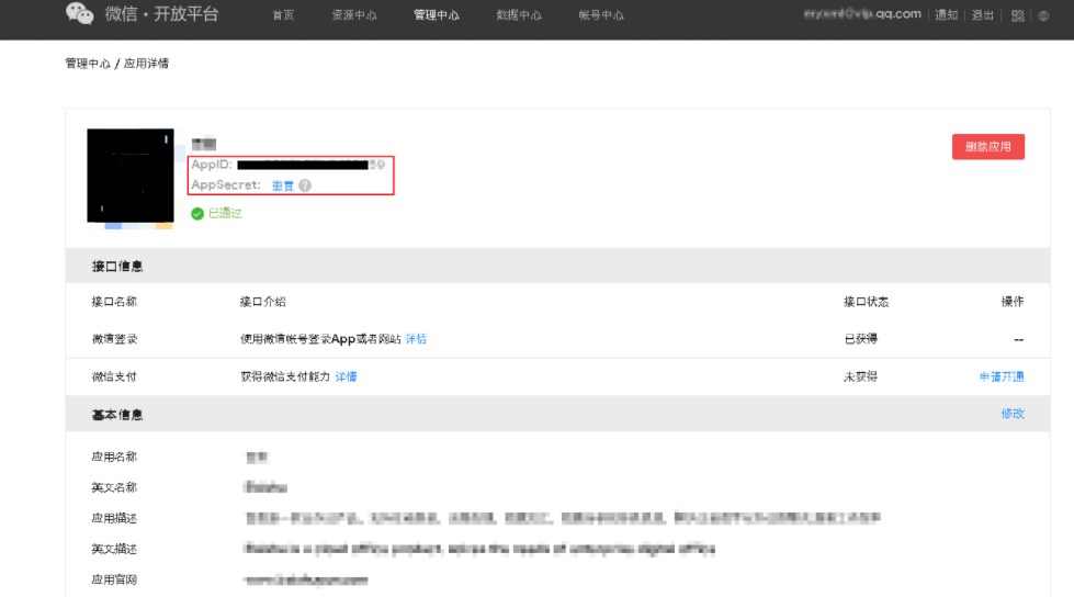 审核通过后,在管理中心->网站应用可以看到已通过审核的应用,点击查看即可看到应用的详细信息;