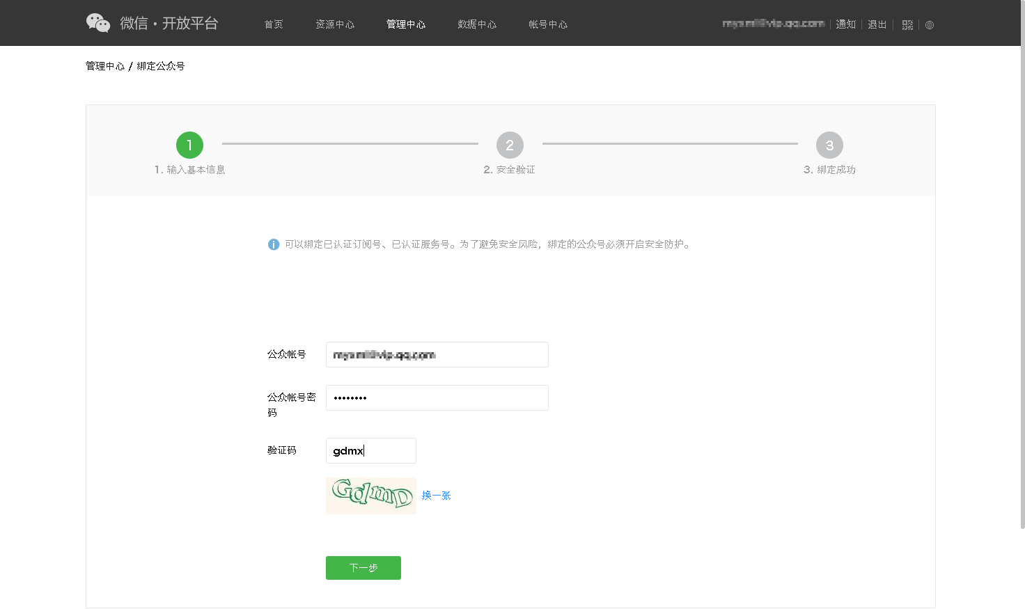 首先需要在微信开放平台登录后,进入管理中心->公众账号->绑定公众号->填写公众号账号密码->扫码验权
