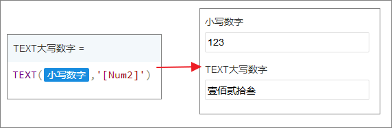 TEXT(123,"[Num2]") 结果为 壹佰贰拾叁