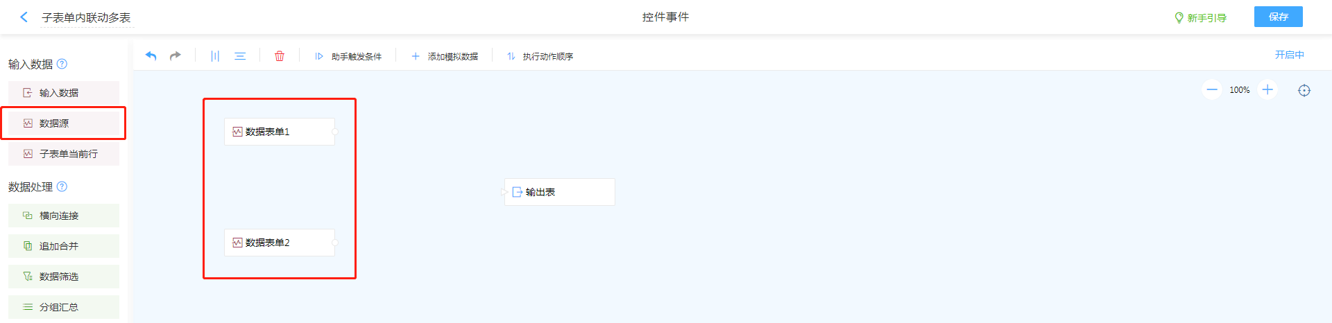 数据源,找到需要关联的表单,如果需要多个子表单之中调取数据,则需要将所有子表单均进行操作,列出多个数据源。