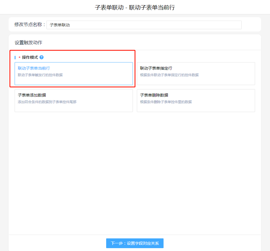 子表单联动,操作模式选择"联动子表单当前行",设置联动对应关系。