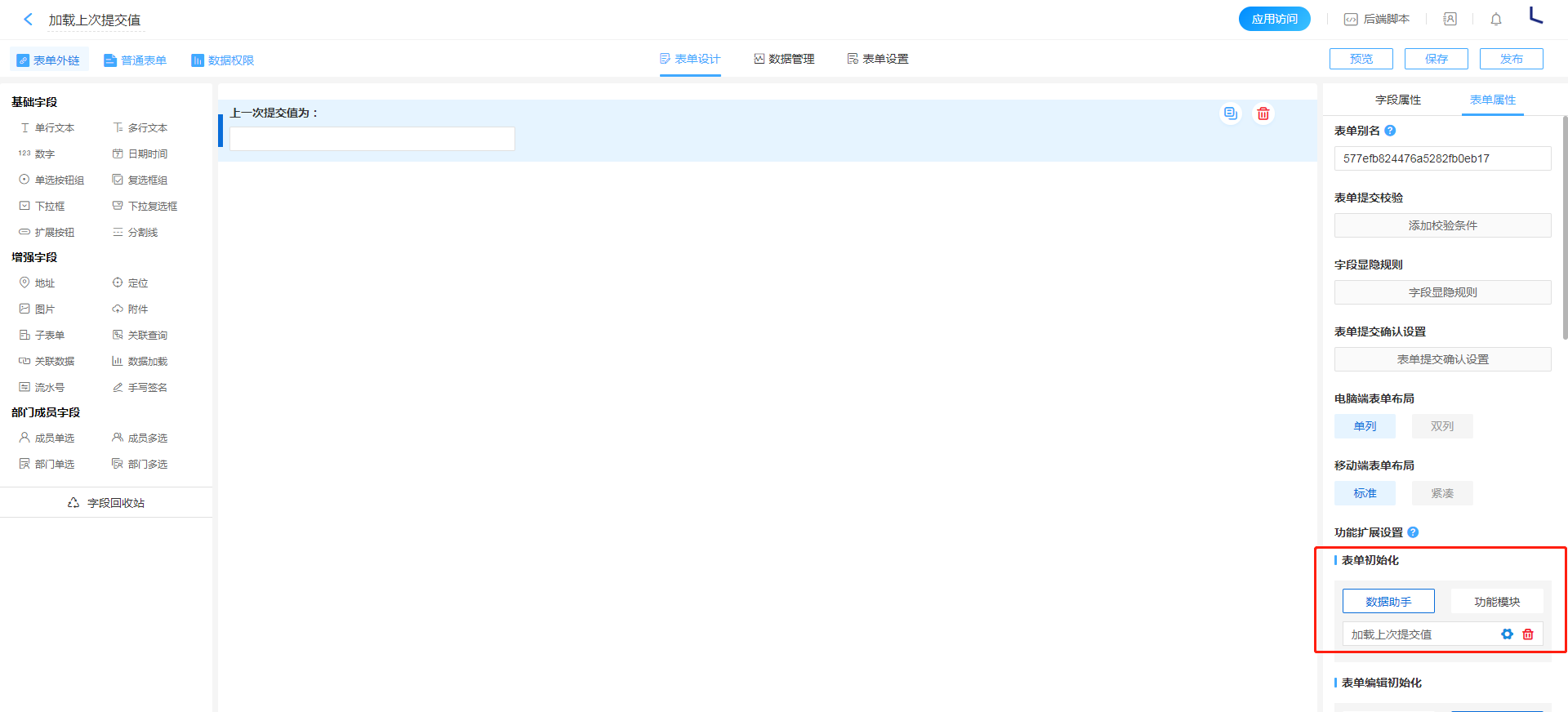 通过对表单初始化以及控件按钮触发进行数据助手配置,实现利用数据助手加载上一次表单提交数据内容。