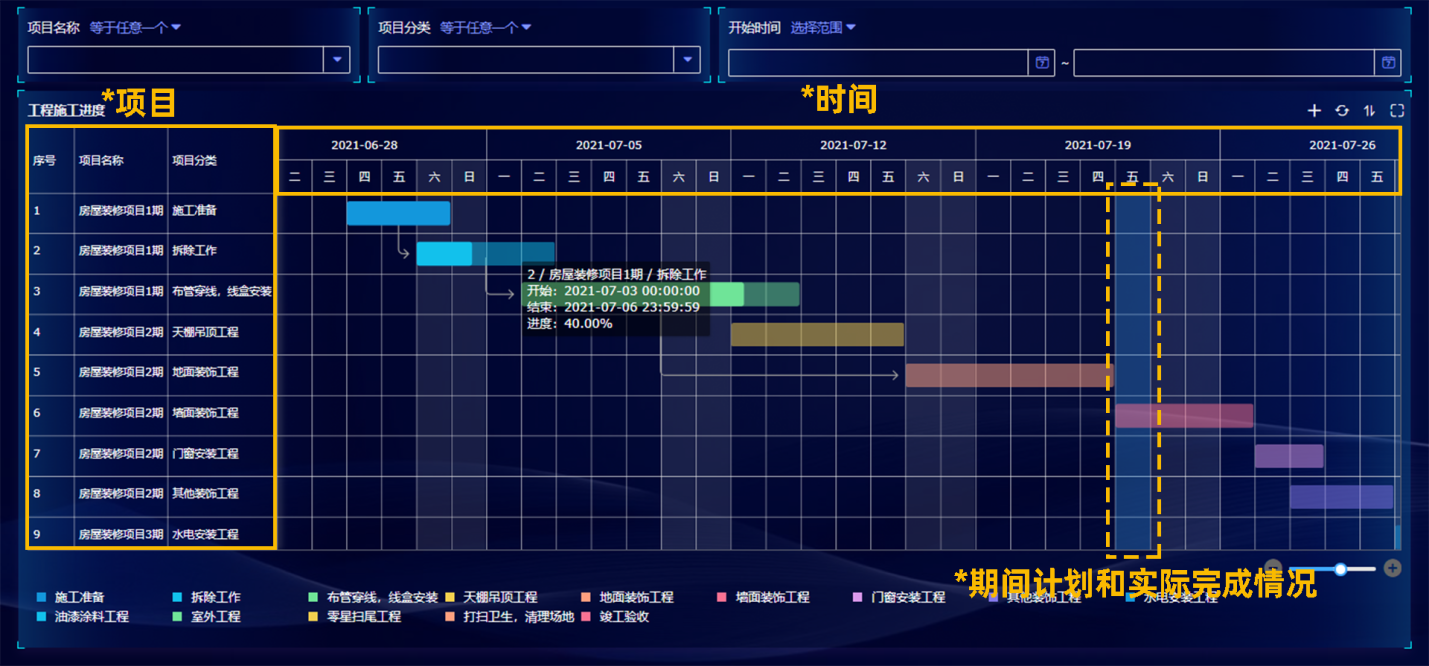 甘特图是将任务与时间联系起来的一种图表形式,以图示来显示项目、进度、和其他时间相关的系统进展的内在关系,随着时间进展的情况,直观表明计划何时进行、进展与要求的对比。除此之外,甘特图还可以应用在各类预约场景的数据展示,如会议室预约情况、课程预约情况等。