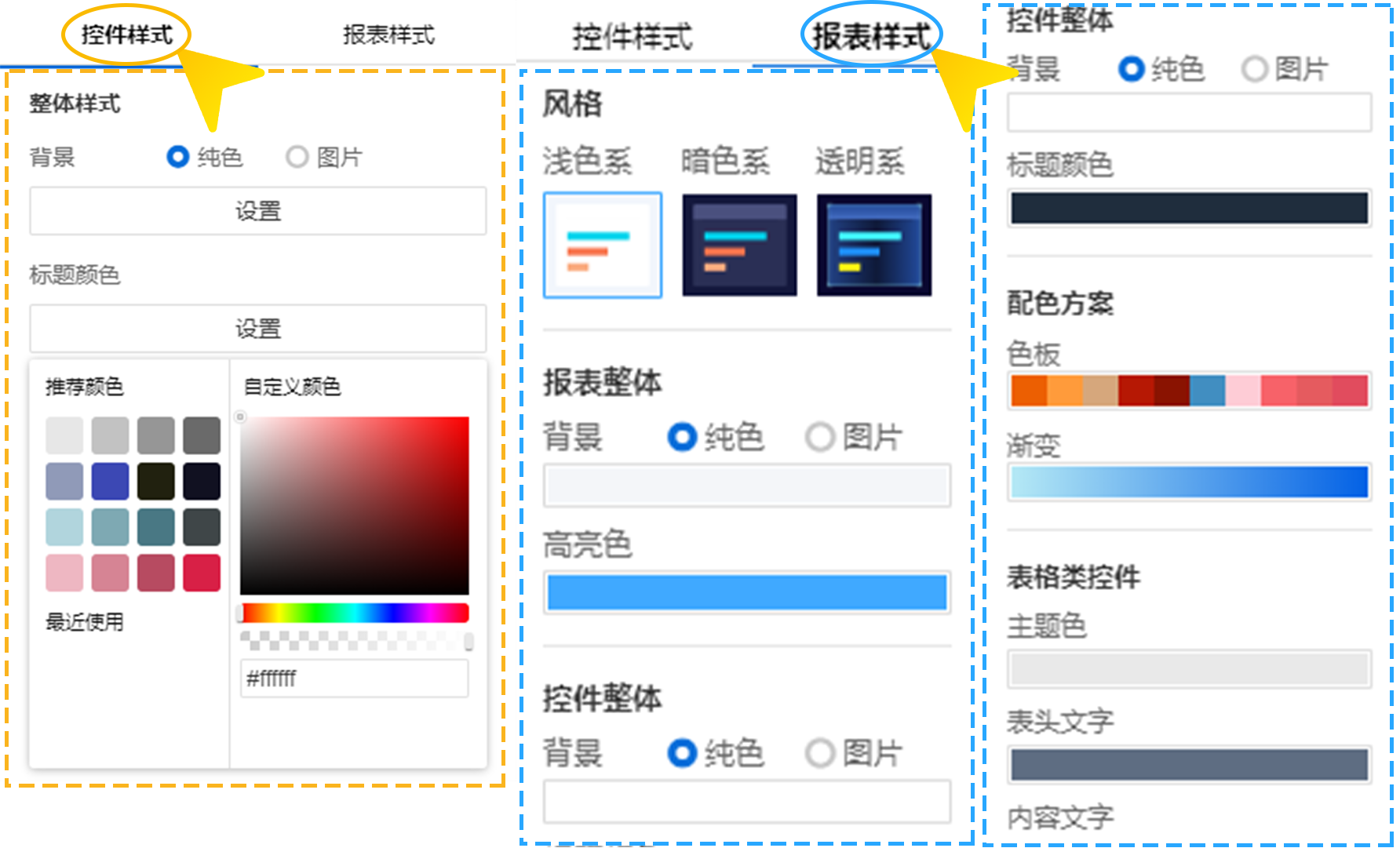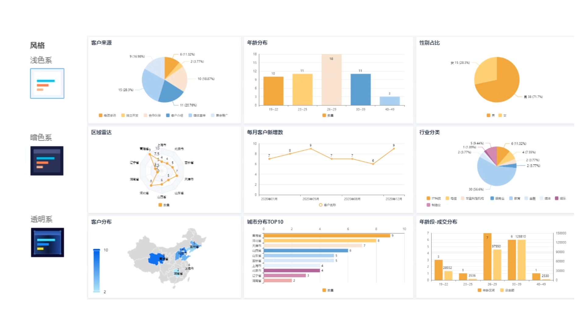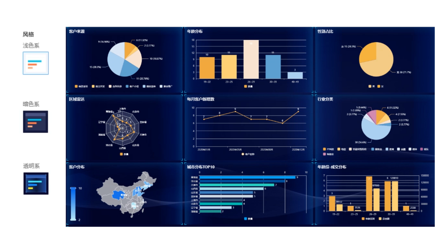可对现有报表进行编辑,通过分析报表整体样式设置可以快速完成仪表盘视觉风格的转换。市面上酷炫的报表看板制作过程较为复杂,而百数不仅对于单个组件的特殊展示需求支持单独配置,也支持快捷设置报表整体风格,风格一键即可切换。