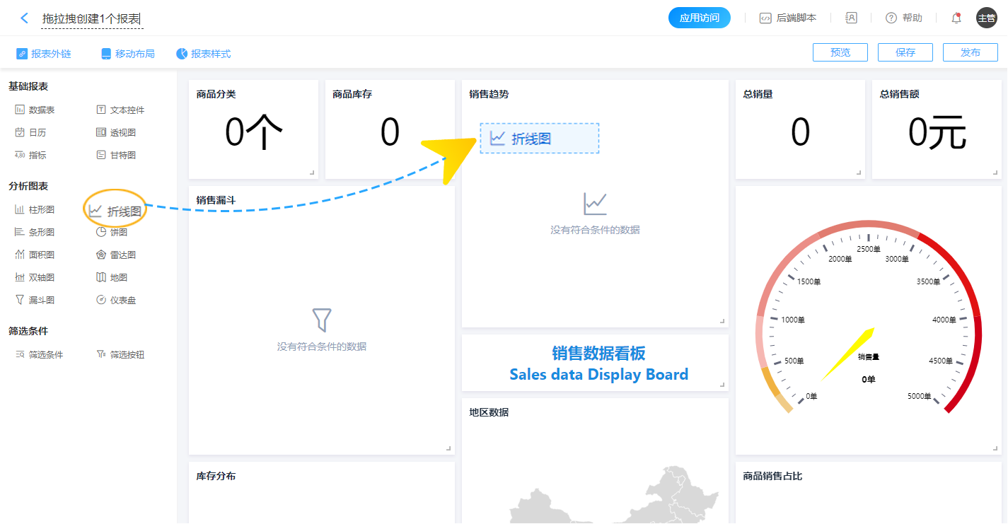 百数提供多样化图表、控件、表格等组件,不必预先导入数据,用户可以直接直接将所要呈现的组件拖拽到画布上进行自由配置和布局,通过简单的点击拖拽即可生成可视化页面,不写一行代码就能轻松编辑操作,让懂业务的人自己完成分析。