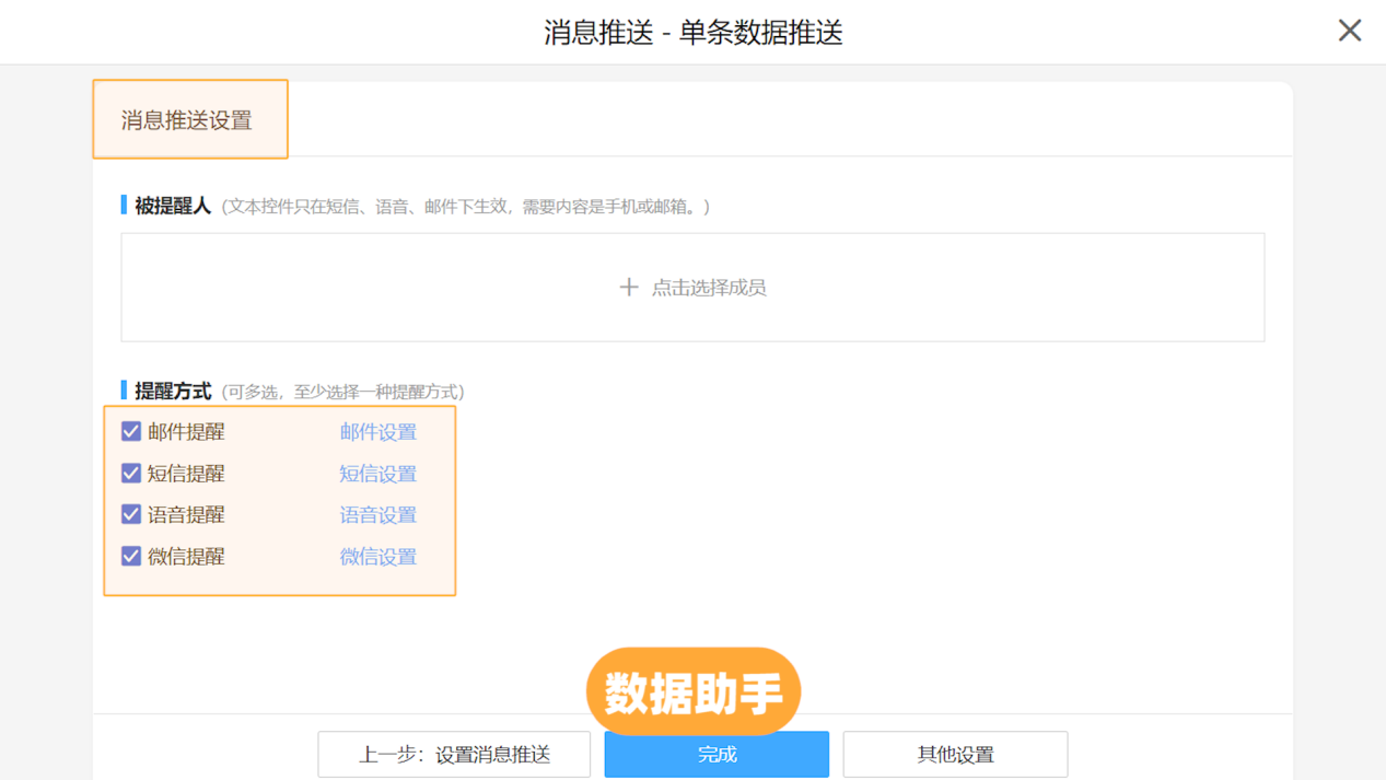 「推送提醒」在表单、流程表单、数据助手三个入口均可进行设定,以便于用户在不同的业务场景下及时处理任务以及了解最新情况;