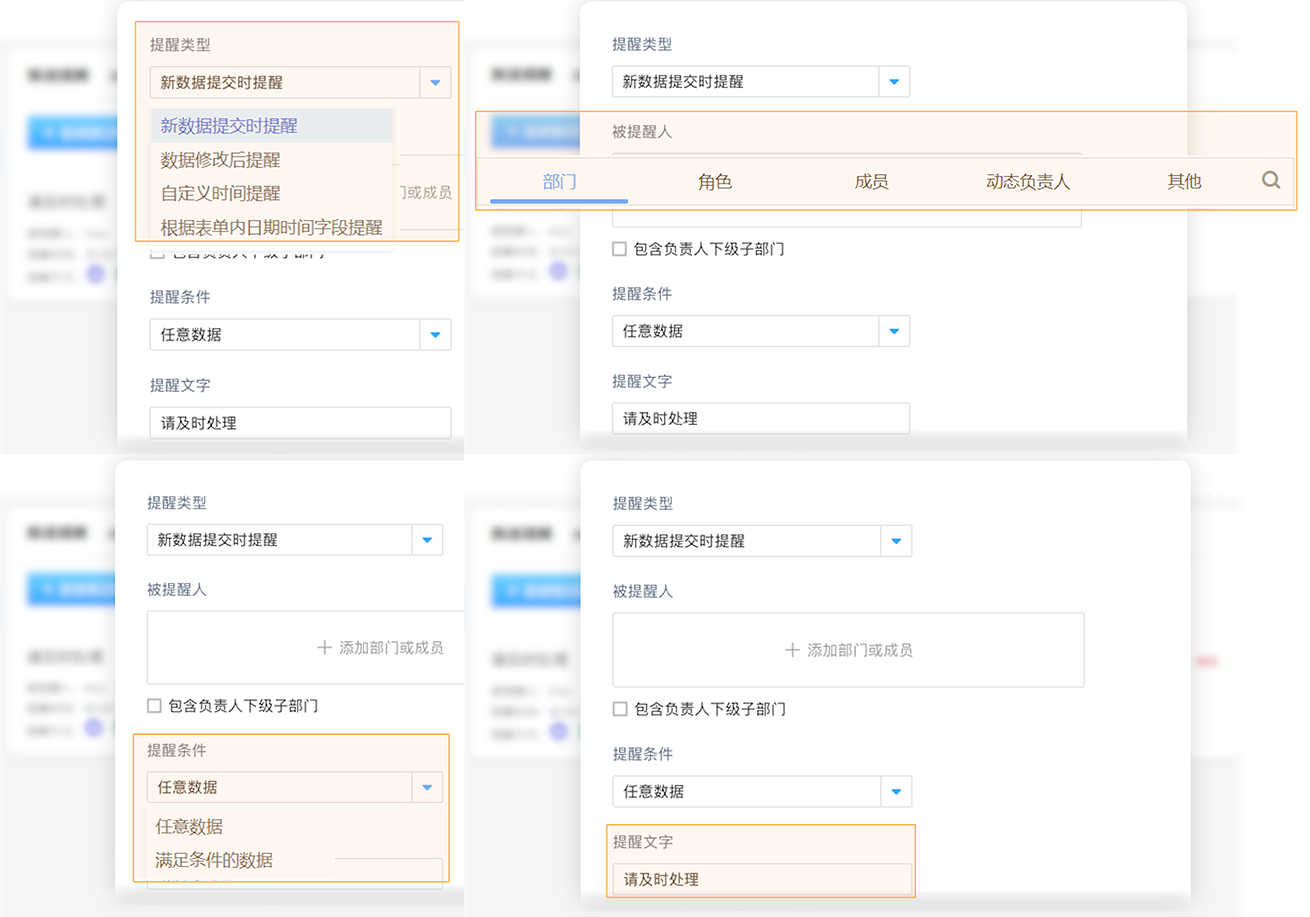 「推送提醒」可以设置指定时间/方式/数据/提醒人,即在什么时候、把哪些数据、用何种方式、提醒给谁,被提醒人可以设置成表单内的成员控件或部门控件,且可以设置重复周期,比如员工生日提醒一年提醒一次,被提醒人可以是行政部或人事部等。发送类型/对象/快慢皆自由设定,此外还可以自己填写提醒的文字内容,是一种完全由你掌控的提醒方式。