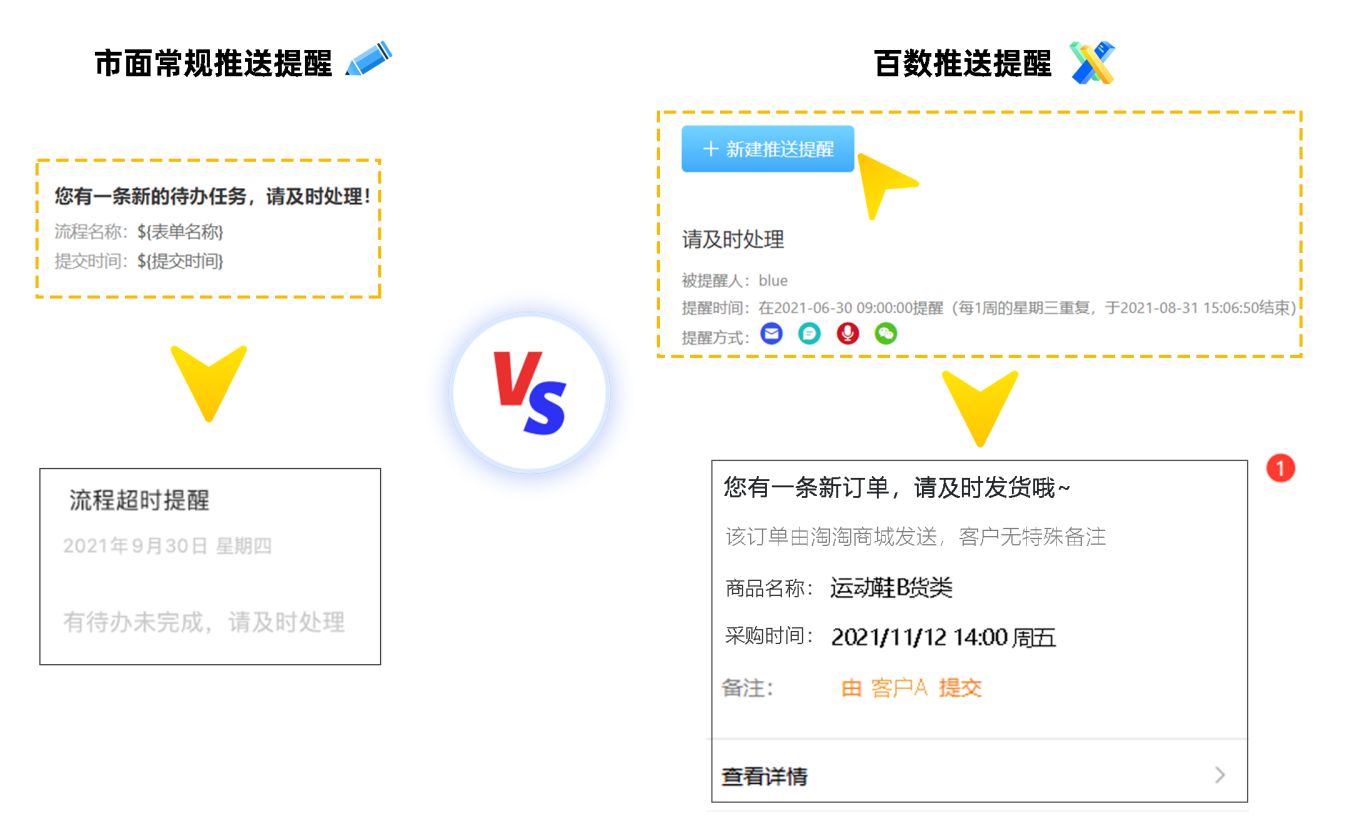 而百数的「推送提醒」功能可以在满足提交条件之后,将需要提醒的数据,使用指定推送渠道发送给指定被提醒人相应的提醒信息,让消息提醒更准确、及时、直观地送达被提醒人并进行处理,使消息与业务直接挂钩。