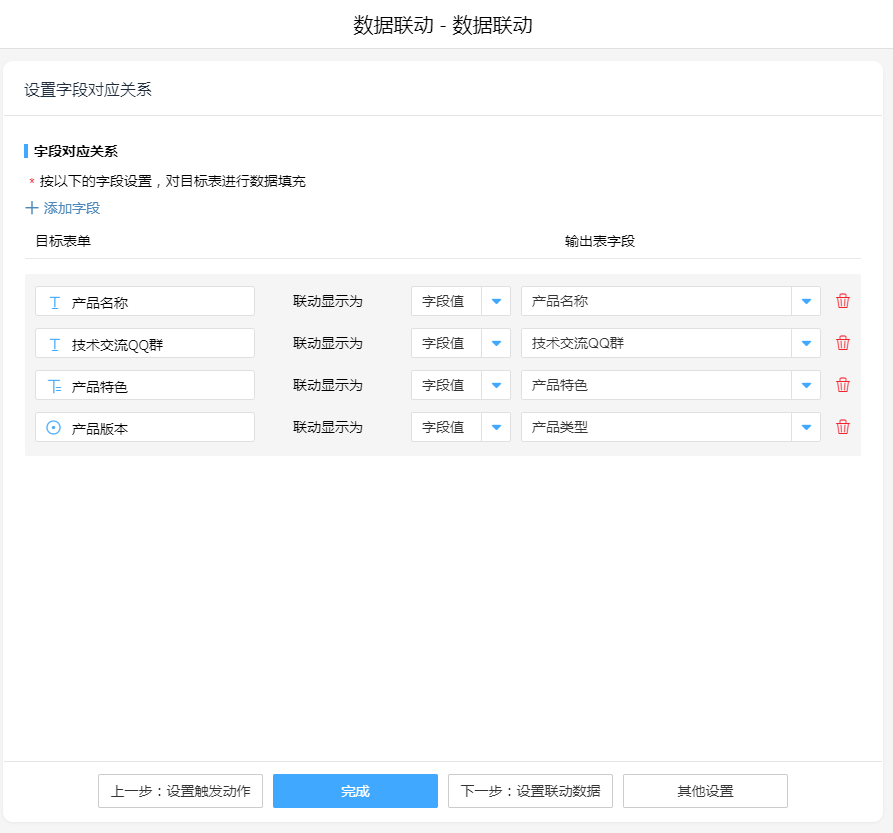 1. 添加执行动作数据关联,将两表字段进行联动。