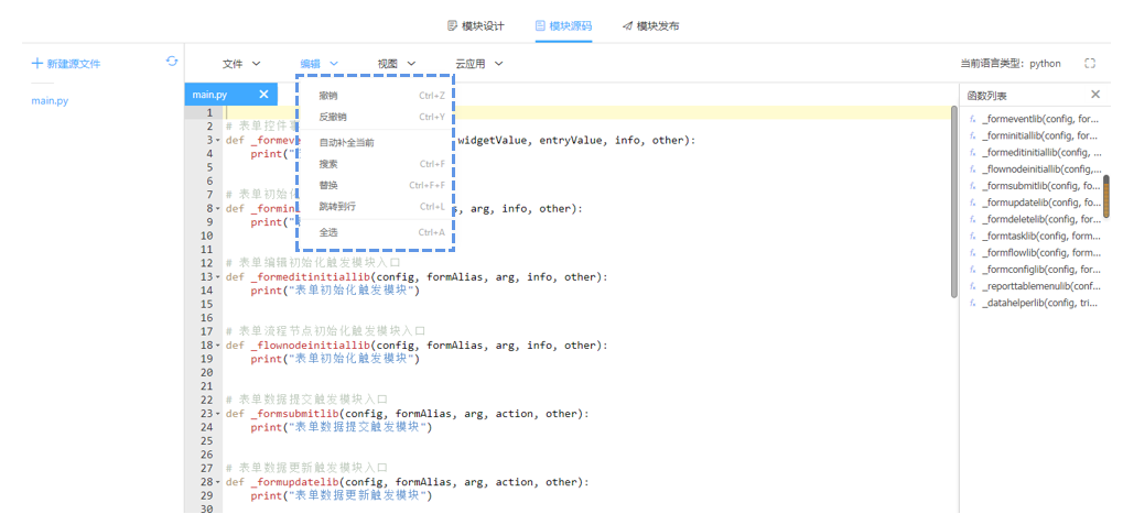 诚然,功能插件通过python封装而来,如果想进一步优化应用百数也给与了代码在线编辑的权限。选中【插件源码】,编辑菜单中包含了一些常用功能并备注了快捷键,有代码基础的用户可以实现在线调试编辑代码。