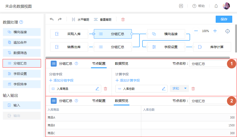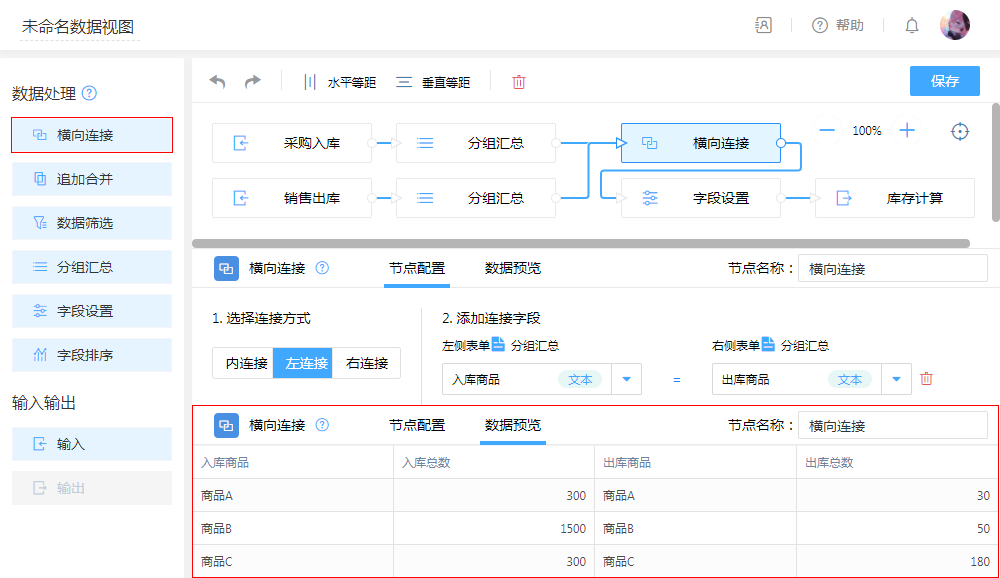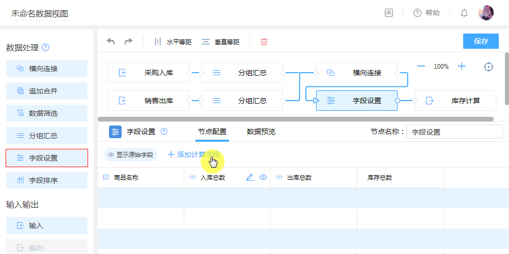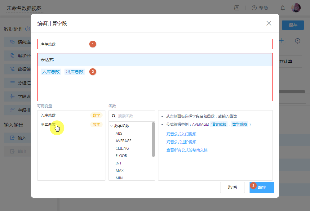 第三步:拖入字段设置添加计算字段,无需复杂的函数,在弹出的编辑框拖拽即可轻松编辑计算公式,以便对传入的数据进行公式计算。即可通过“入库”总数与“出库”总数,计算出最新剩余库存。