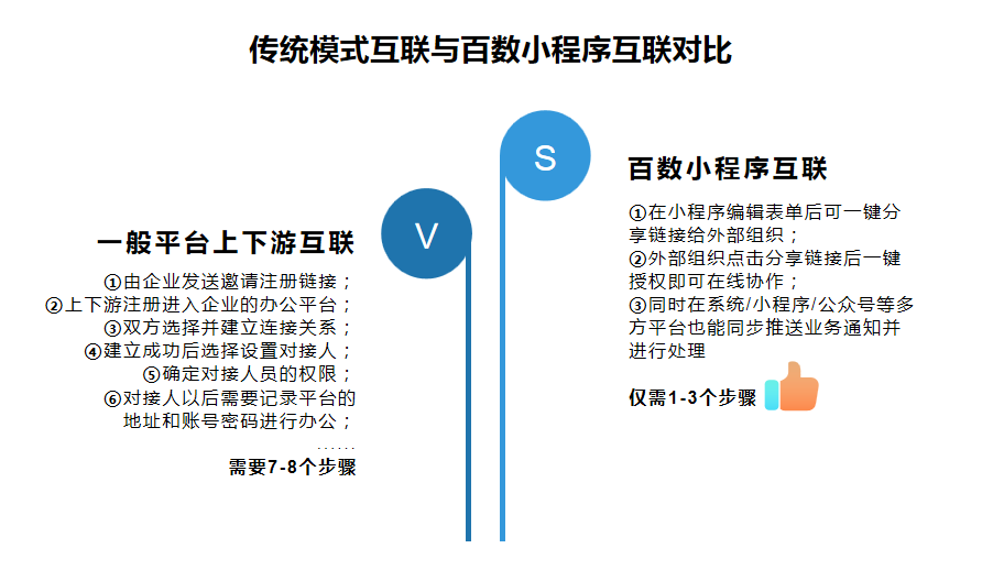 百数在电商领域具备丰富的项目经验,基于供应链上下游协同的应用需求,建立以企业为核心的上下游垂直一体化产业链布局,解决了多家企业供应链协同的难题。一般平台的上下游互联,企业与企业之间的连接过程需要跳转7-8个步骤,操作较为复杂。如果需要链接平台外的企业,还需要借助excel导入外部通讯录进行联系人设置,达不到便捷互联协作的效果,而利用百数小程序只需要1-3个步骤就可以轻松实现一键互联。