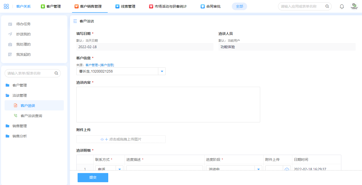 用于客户洽谈进度的记载与历史洽谈记录的查询,方便掌握销售个人工作进展情况以及为阶段性复盘提供细节参考。