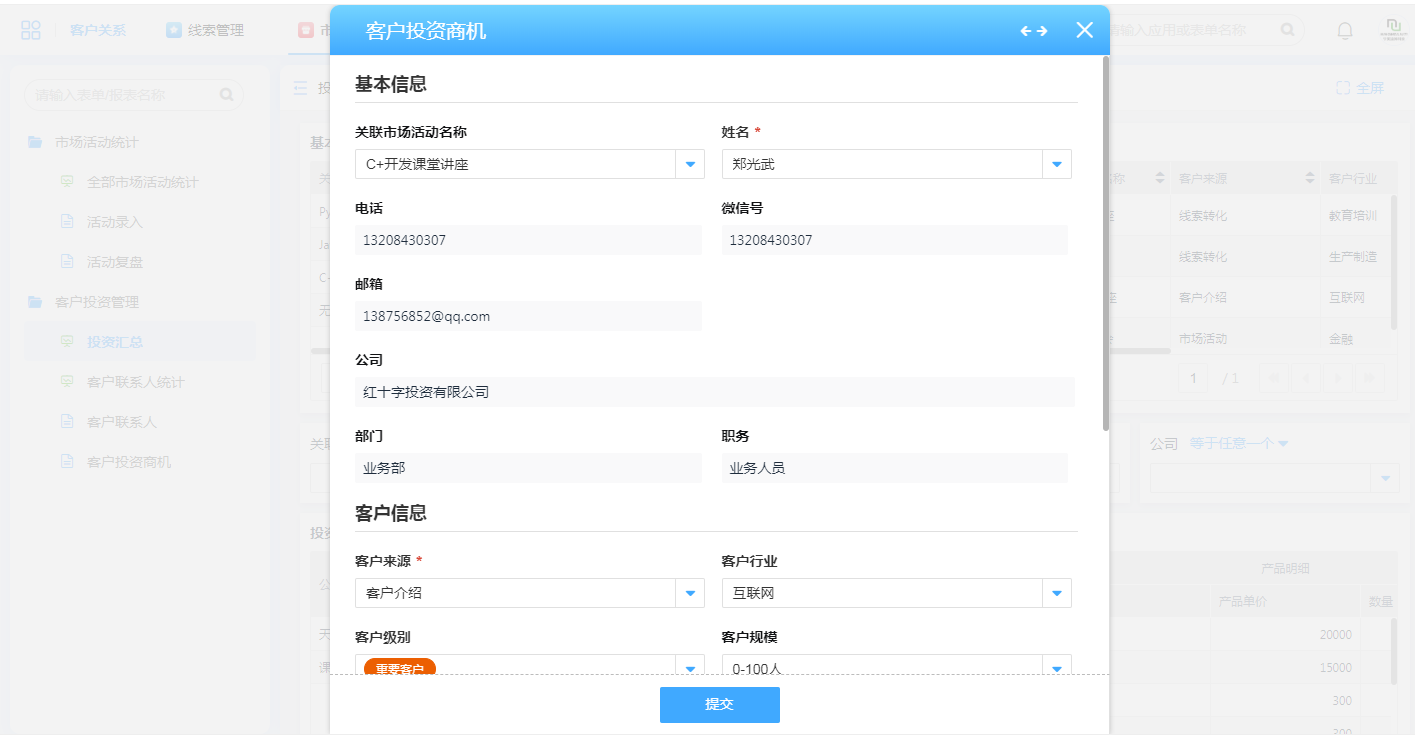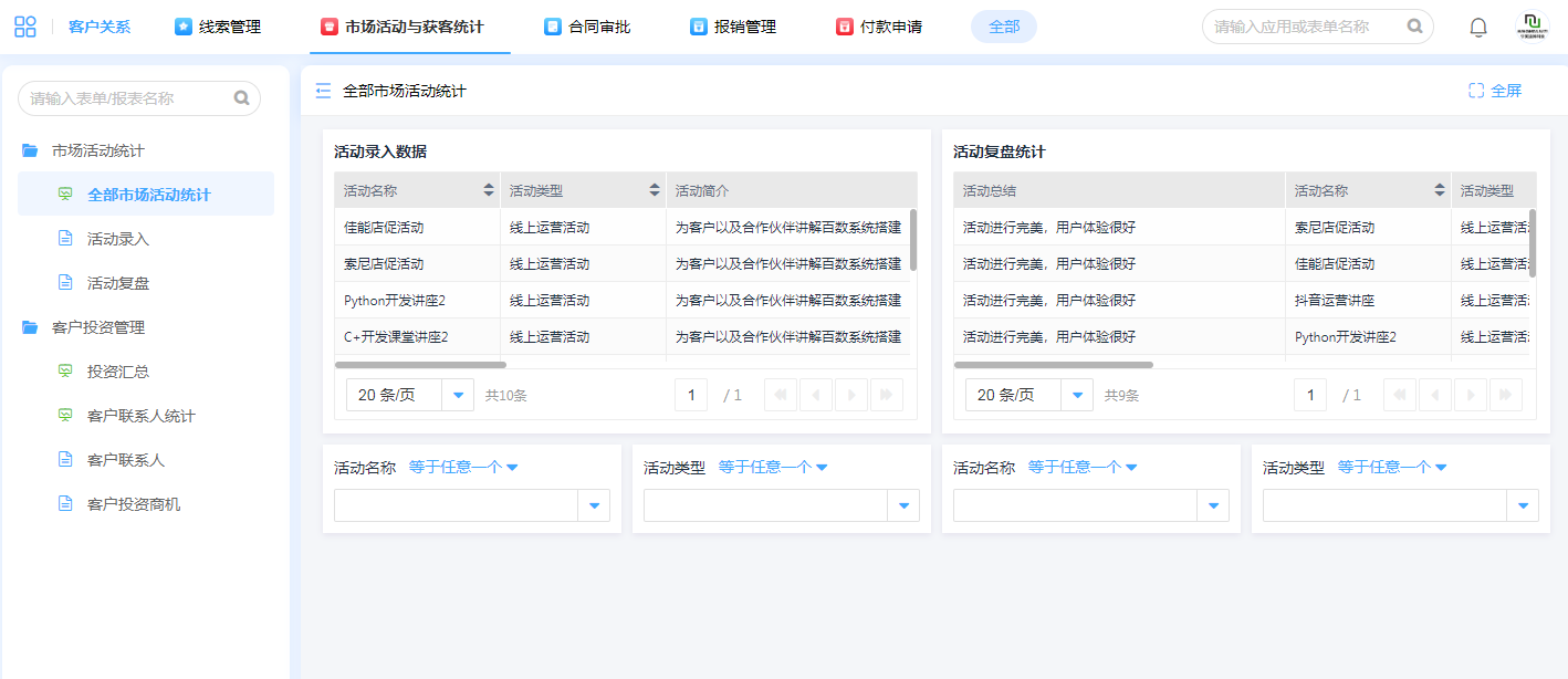 可以有效分析每一次市场活动的投入产出比,根据与市场活动相关联的回款记录及举行市场活动的报销单据做计算,就可以统计出所有市场活动的效果报表。