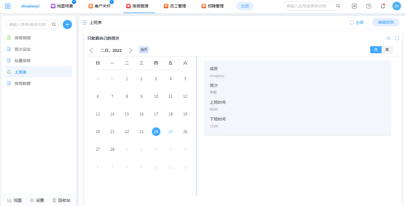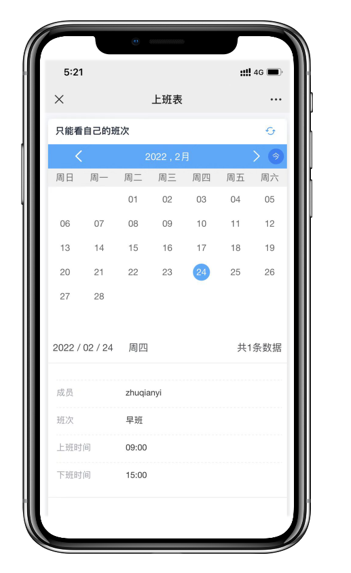 日历的展现形式方便查看自己的排班情况,在移动端也能方便接收排班提醒。