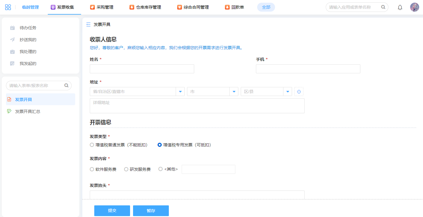 用于公司给客户进行开具发票的填写,公司再根据该模块上的信息给客户开具相应的发票。