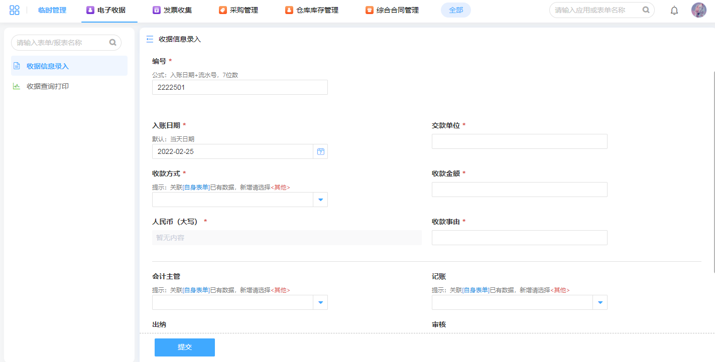 1.收据信息快捷录入