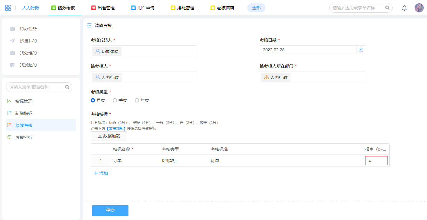 在绩效考核表单通过数据加载可以一键勾选考核指标,修改评分即可完成该指标下的考核判定。