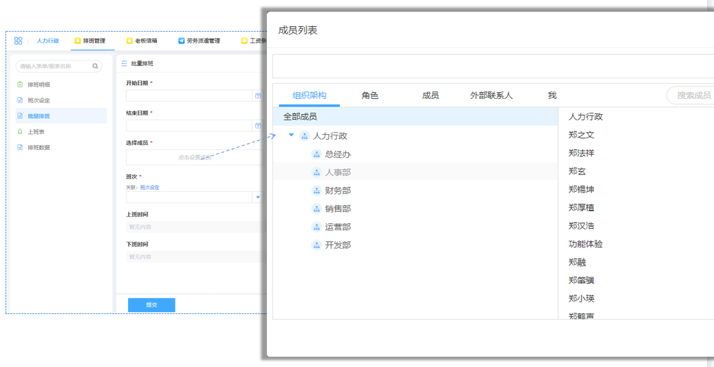 在需要同时操作多个部门或者多个成员的排班安排时,选择通讯录即可在直接勾选企业架构的各个部门以及成员,大大提升行政工作的效率。