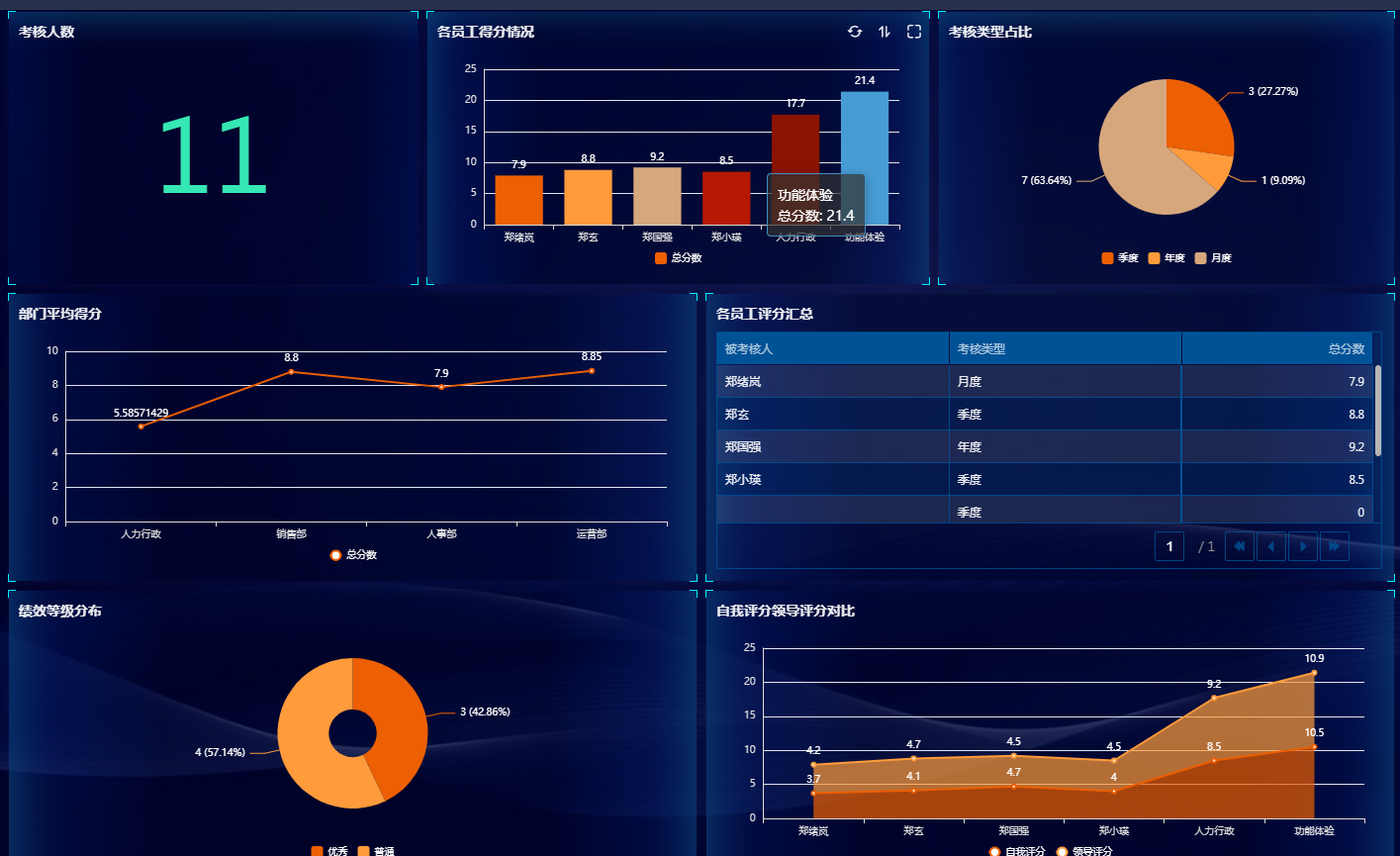 考核信息即时存储、灵活修改,数据图表清晰直观,保证考评公开透明。