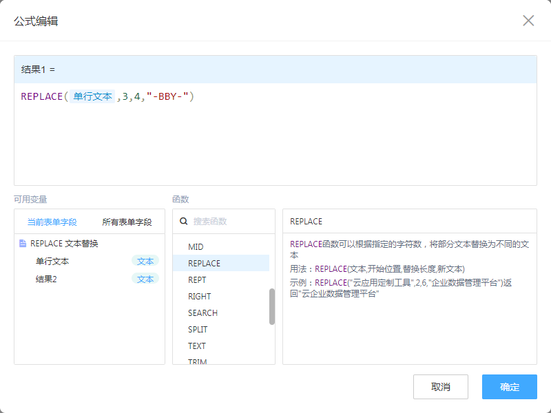 - REPLACE(原始文本, 要替换的字符, 替换成的字符),即将原始文本中的某一字符串用另一个指定的字符串替换。