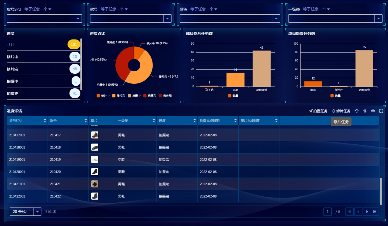 方便查看近期设计工作的进展情况,可一键进入拍摄任务和修片任务分配列表进行任务分配操作。
