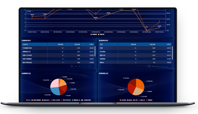 通过可视化分析报表来展示公司运营概况、商品销售详情、店铺销售概况等等,丰富的报表展现形式更有利于不同维度的数据分析。