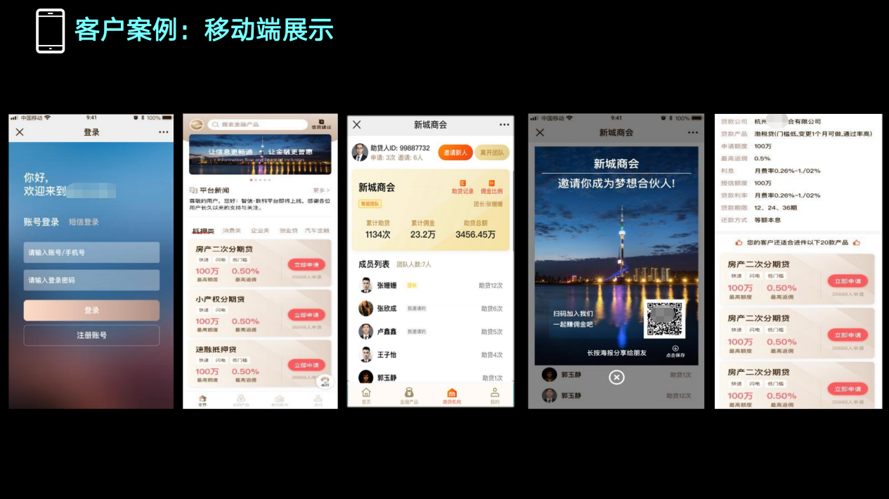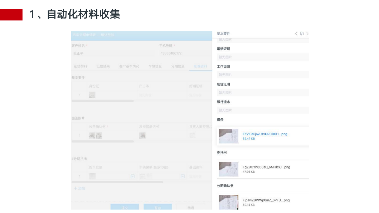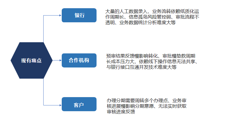 1.快速 全电子化流程操作,移动办公,自动化智能审批,从T+10缩减到T+0。 2.体验 客户经理、审批人员、合作机构、客户的业务体验大幅度上升,借助科技手段优化人工操作,极大程度减少劳动力。 3.决策 全面的报表系统、运营分析平台,融入丰富的行业运营经验,为决策提供更高 的前瞻性。 4.整合 整合机构、数据平台、卡系统、核心系统等行内、行外多端系统及资源,集中在一个系统管理。 5.风控 全方位的客户画像、交易风险识别 、机构管控、贷后监控,为分期业务全生命周期保驾护航
