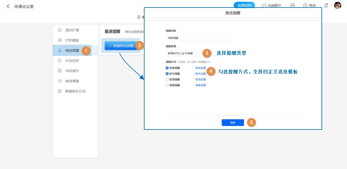 位置:【表单设置】——【推送提醒】——【新建推送提醒】——【提醒类型】——【数据被评论@时提醒】