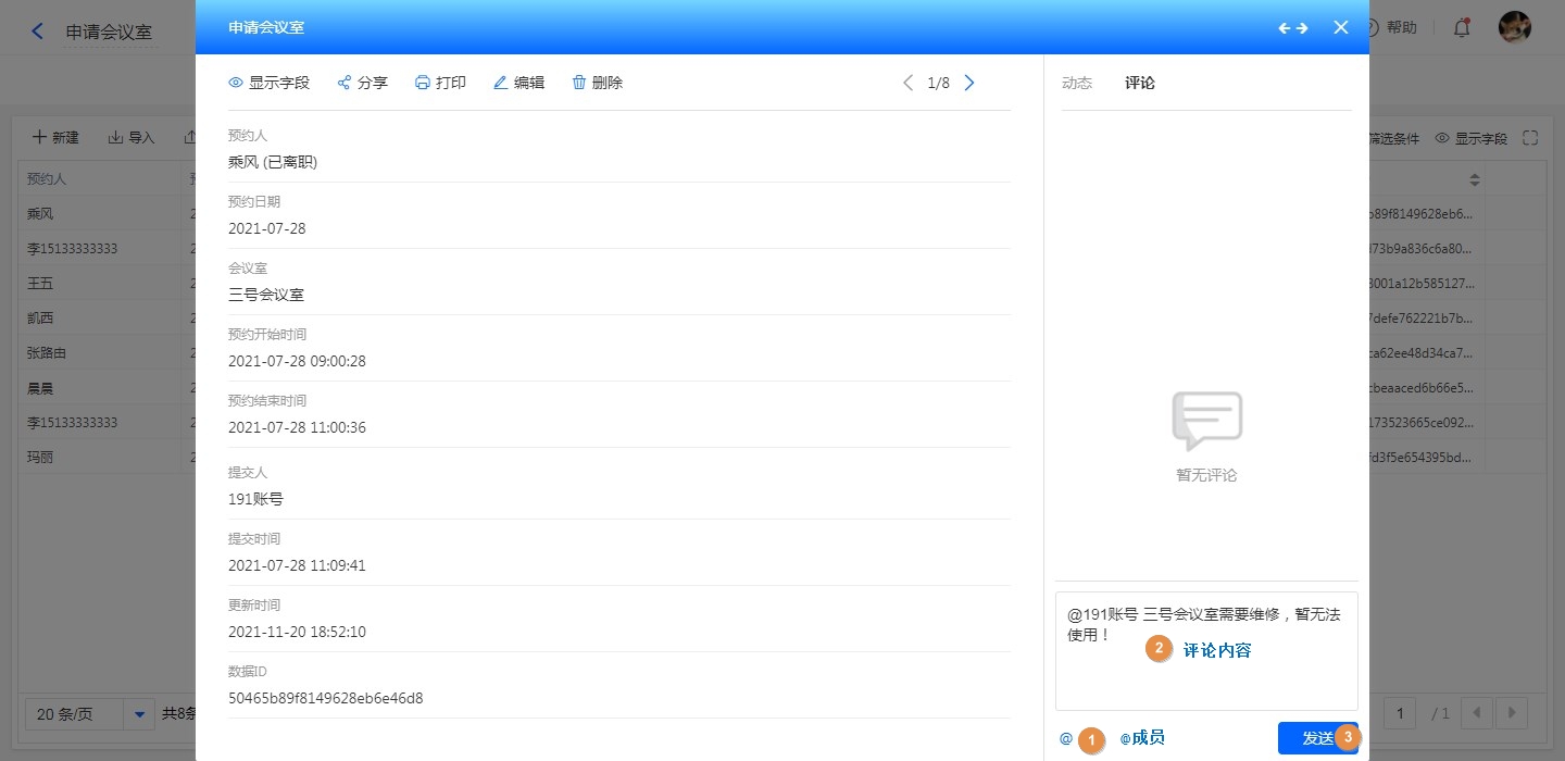 可在数据管理查看单条数据、流程审批、报表查看单条数据、单条数据分享内链等场景中发表评论。
