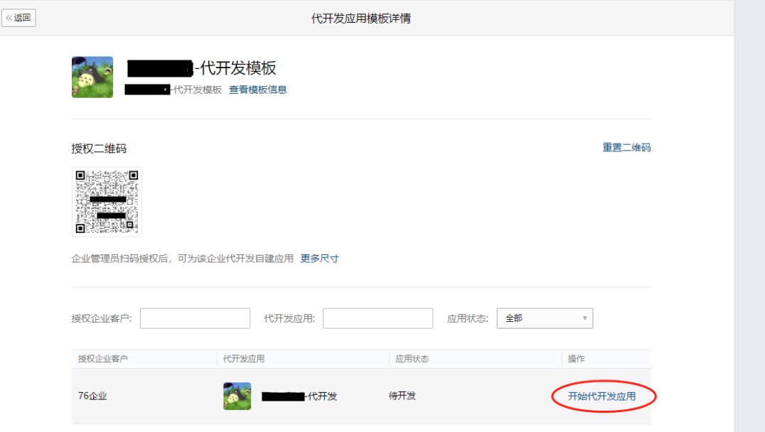 1) 进入 [企业微信服务商后台] - [应用管理] - [应用代开发] ,点击提供给企业扫码授权的代开发模版,进入模版详情页,可以查看该代开发模版对应的企业授权列表。