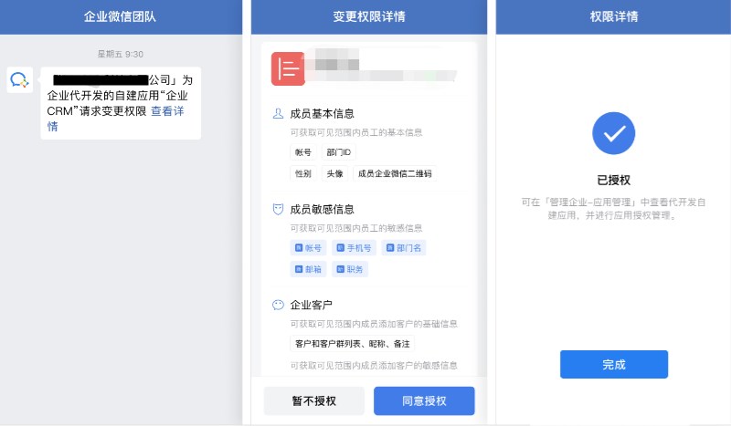 4) 企业客户管理员收到代开发应用权限变更消息,若企业同意权限则服务商所选择的自定义权限立即生效。