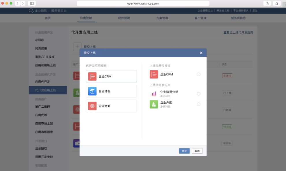 ● 提交上线页,左侧先选择需要上线代开发应用所属代开发模版,然后在右侧,选择这个模版下需要提交上线审核的企业代开发应用,确定提交,则该企业代开发应用进入上线审核流程。