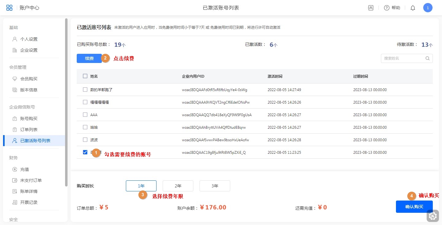 已激活账号可以进行续费操作。