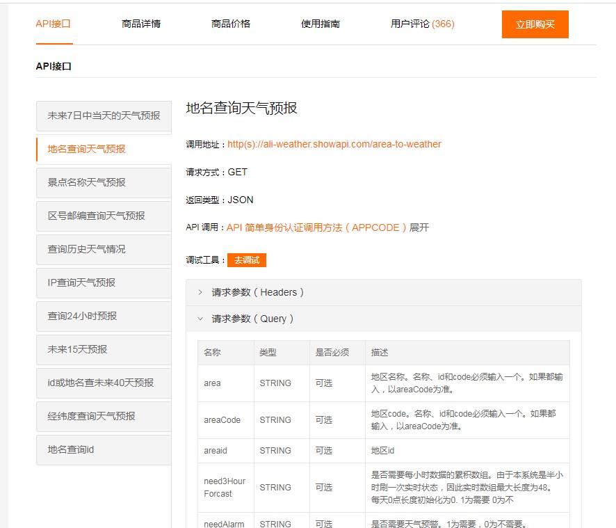 【调用地址】:https://ali-weather.showapi.com/area-to-weather 或 http://ali-weather.showapi.com/area-to-weather