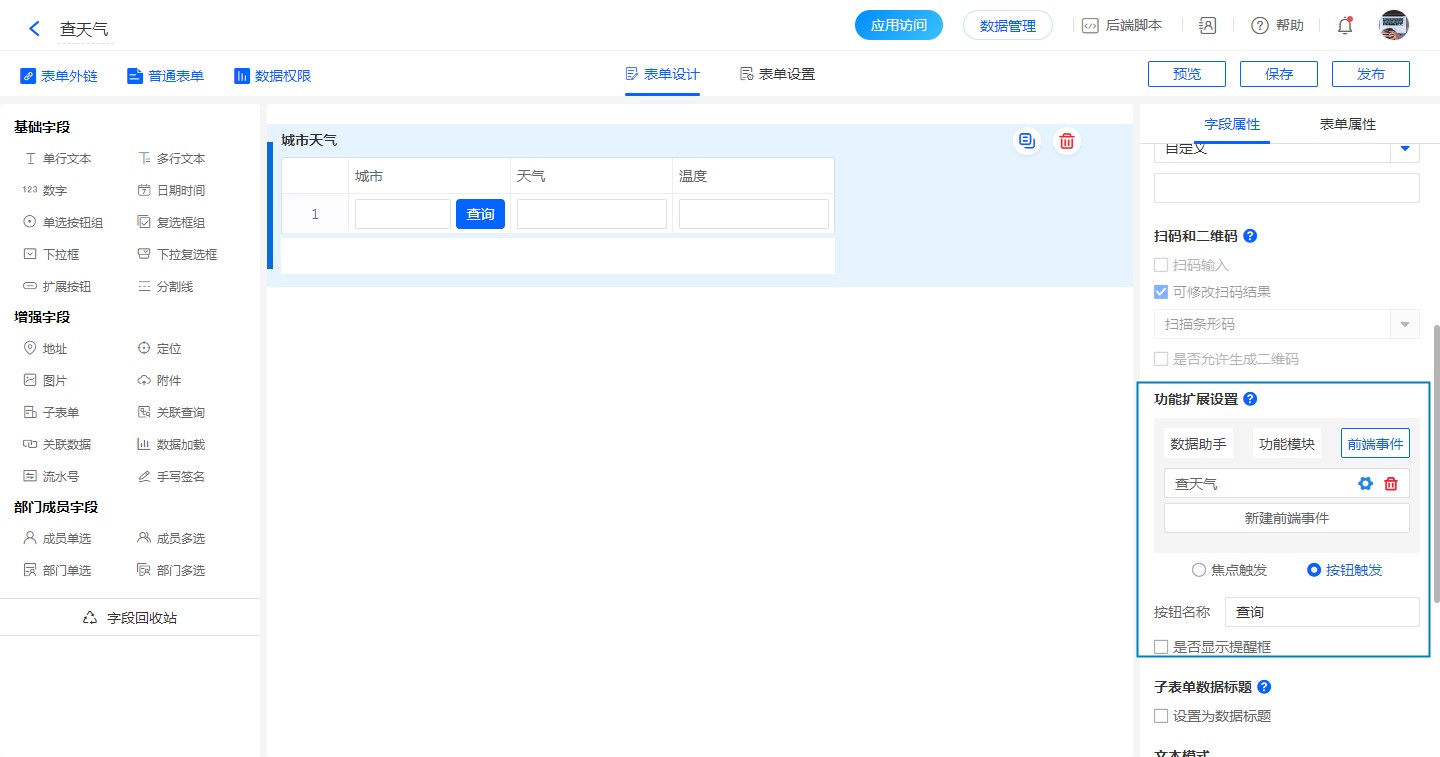新建天气查询表单,设计字段: