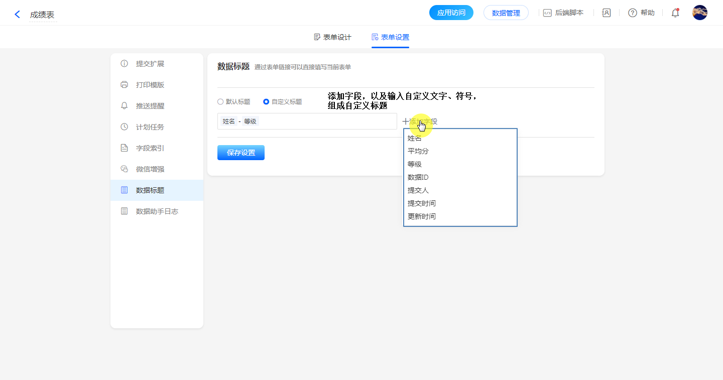 如下图,成绩表单的第一个字段是[姓名],则默认标题是[姓名]。