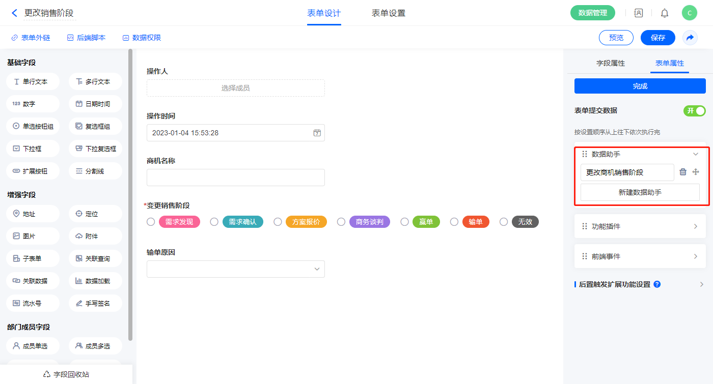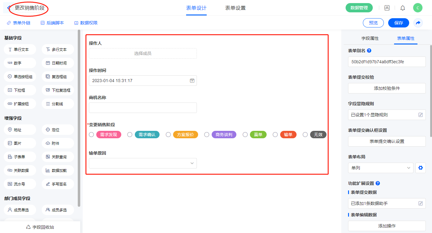 2.4、辅助表【更改销售阶段】字段及表单属性设置