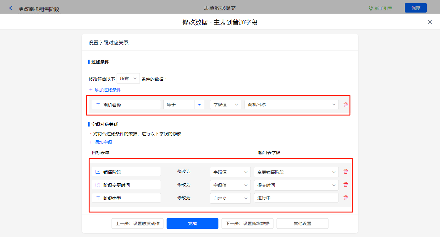 触发条件设置为当【变更销售阶段】字段等于【输单】,则修改主表【输单原因】、【销售阶段】、【阶段变更时间】、【阶段类型】四个字段的值;