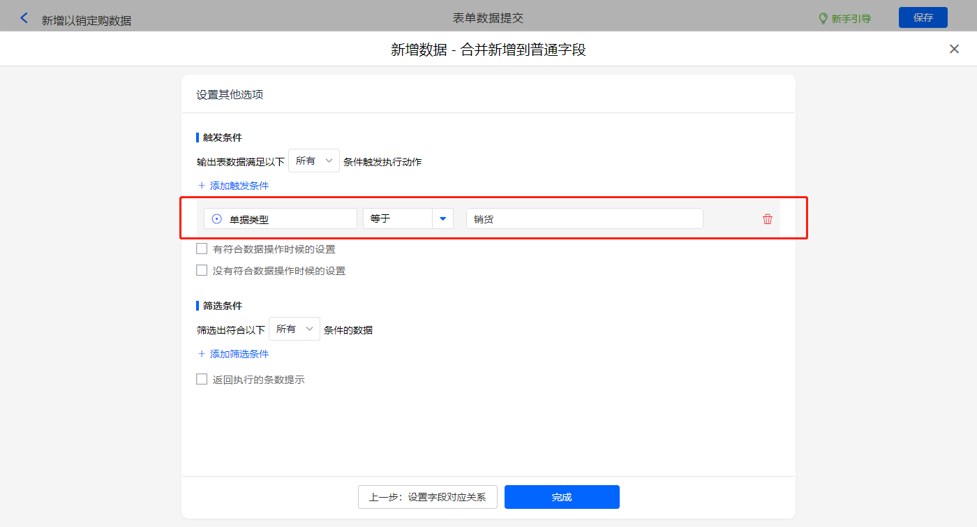 其他设置触发条件为【单据类型】字段等于销货,设置好点击【完成】并保存该数据助手;