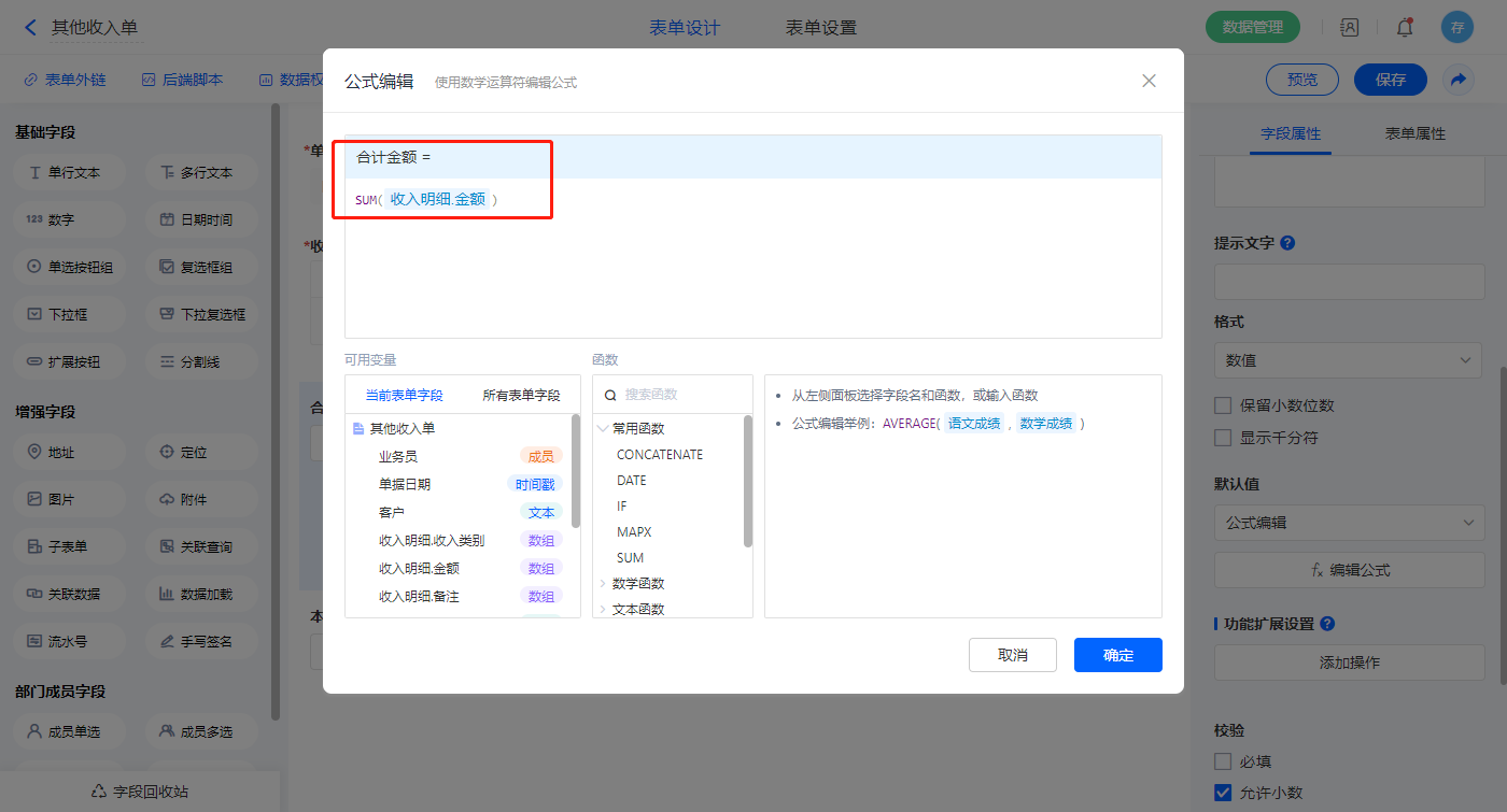 1)【合计金额】字段默认值设置为公式编辑,如图设置公式;