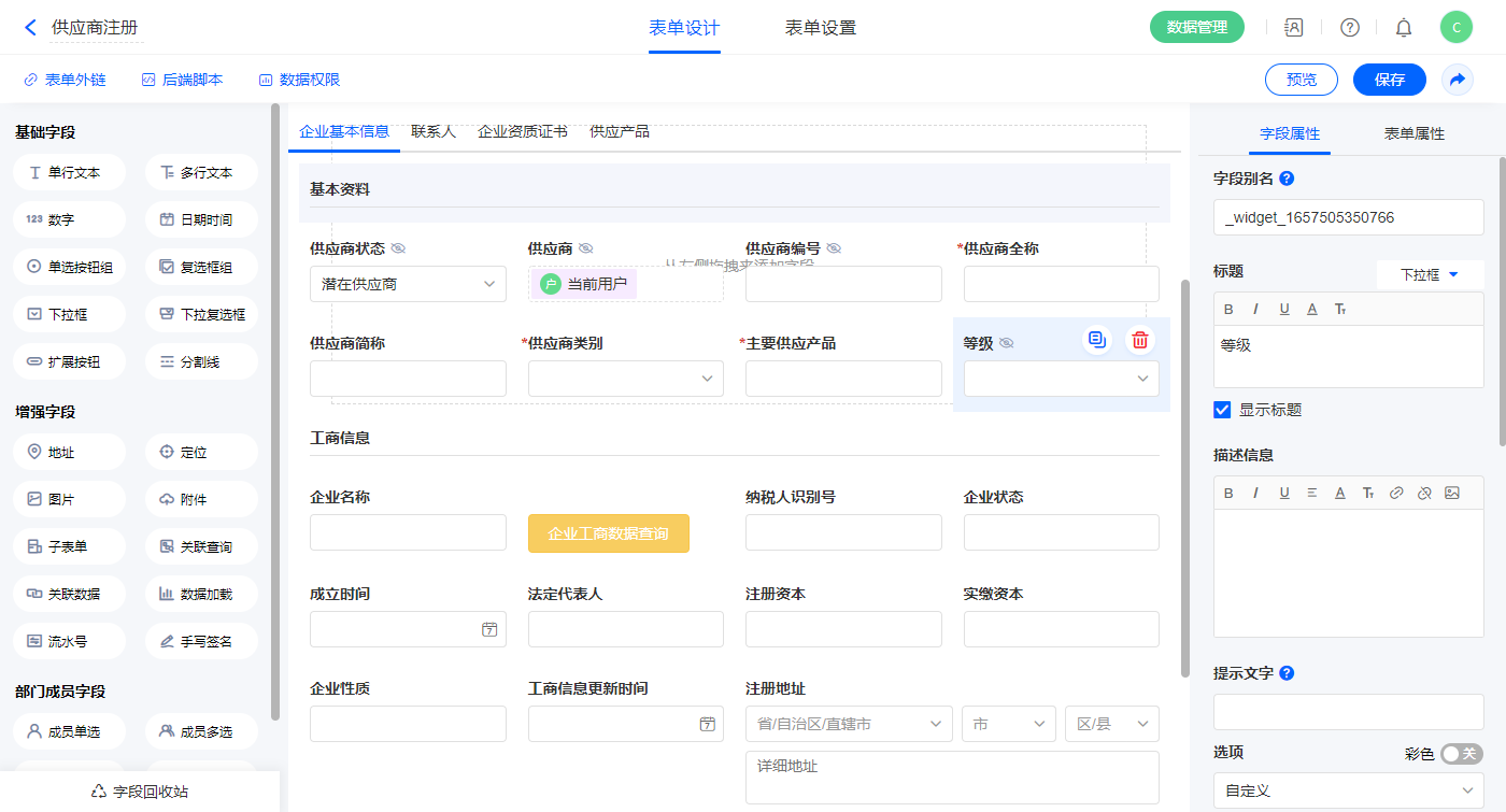 2.2、表单【供应商注册】字段及表单属性设置