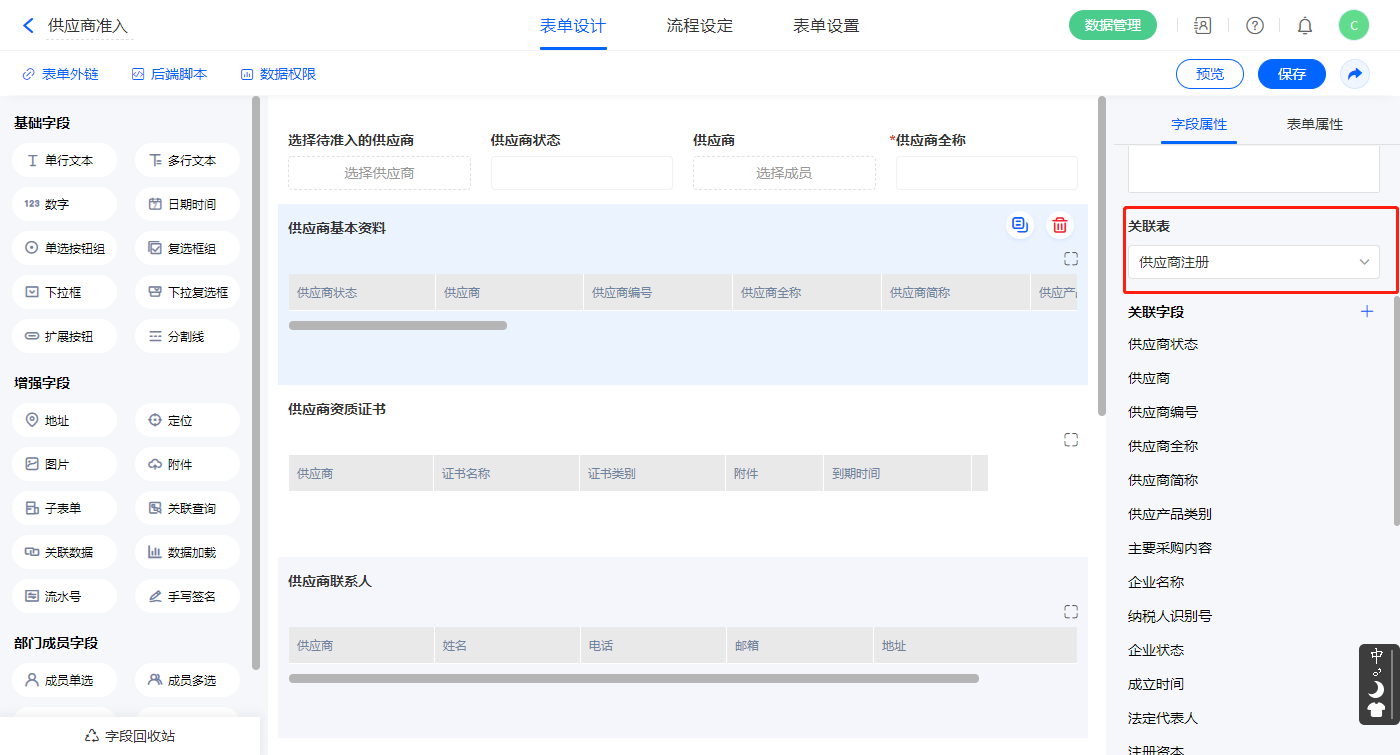2)【供应商基本资料】关联查询字段,设置关联表为【供应商注册】并如图选择关联字段,设置显示数据条数为多条,并设置关联条件为【供应商】字段;